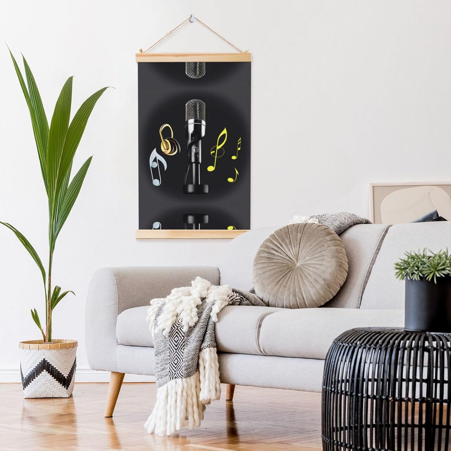Our Microphone With Music Notes Print Wooden Poster Hanger Is An Excellent Addition To Your Home Decor Or A Perfect Gift For Friends And Family. Made Of Selected Quality Canvas With Brilliant And Enduring Colors, This Wall Art Is Designed To Resist Water, Dust, And Fading, Ensuring The Bright And Vibrant Art Lasts. The Polyester Is Enclosed Between Two Teak Wood Hanger Scrolls With An Attached 35cm Rope For Easy Hanging. Installation Is Made Simple With The Included Two Nails In A Plastic Box. The Modern Minimalist Style Of Our Wall Hanging Complements Any Home Decor, Elevating The Artistic Ambiance And Brightening Up The Room. Experience The Elegant Transformation This Wall Hanging Scroll Painting Brings To Your Spaces Today.