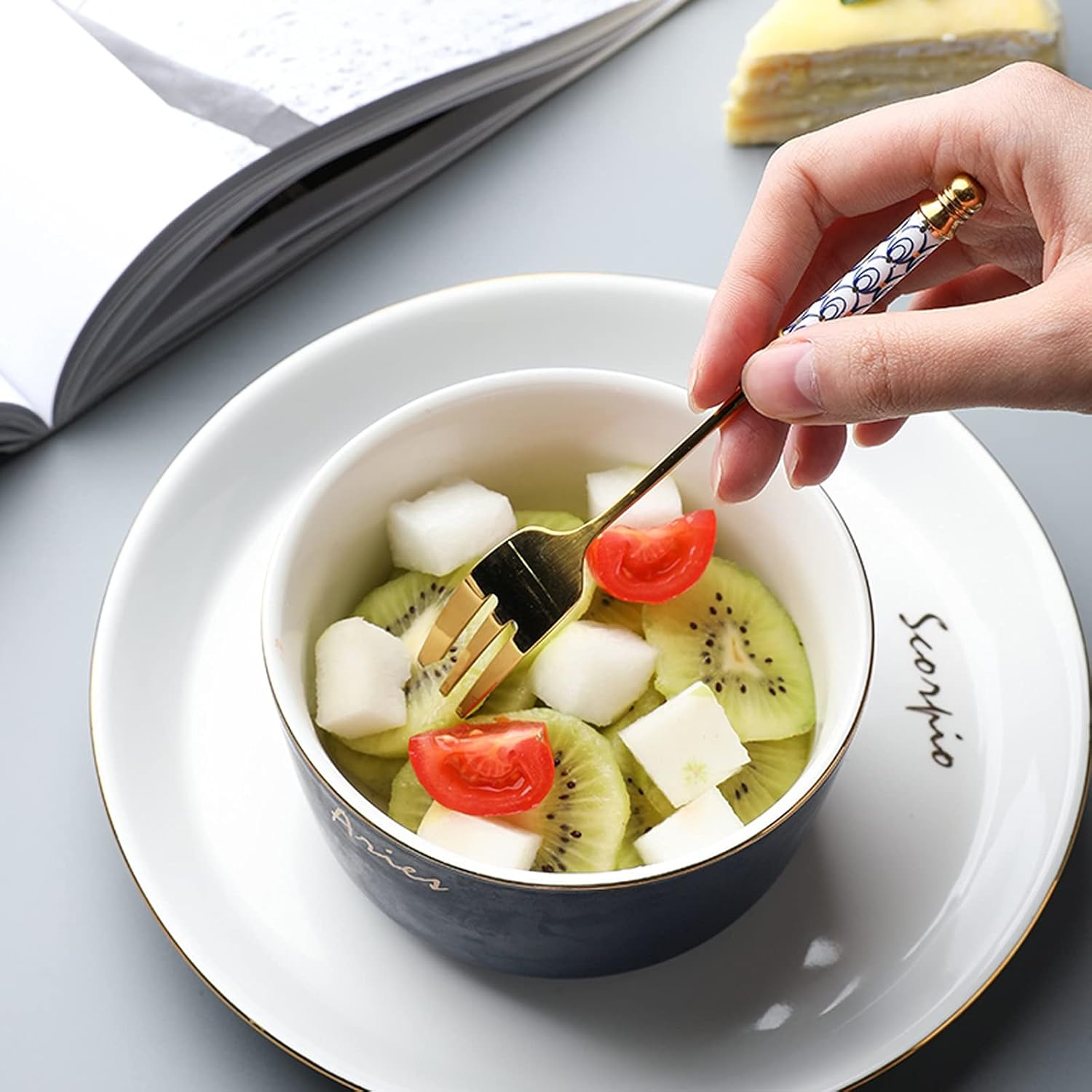 The above data is for reference only, manual measurement of dimensions may have a little error, please allow it, thank you. Product name: dessert spoon Product material: stainless steel + Ceramic Application: family, restaurant, etc. prompt: 1. Please check the size and color before buying. 2. Due to manual measurement, there may be some small errors, please refer to the actual product, thank you. 3. Due to different shooting angles and light, there may be slight chromatic aberration, please understand. 4. There are no other items in the product photos except Dessert Spoon
