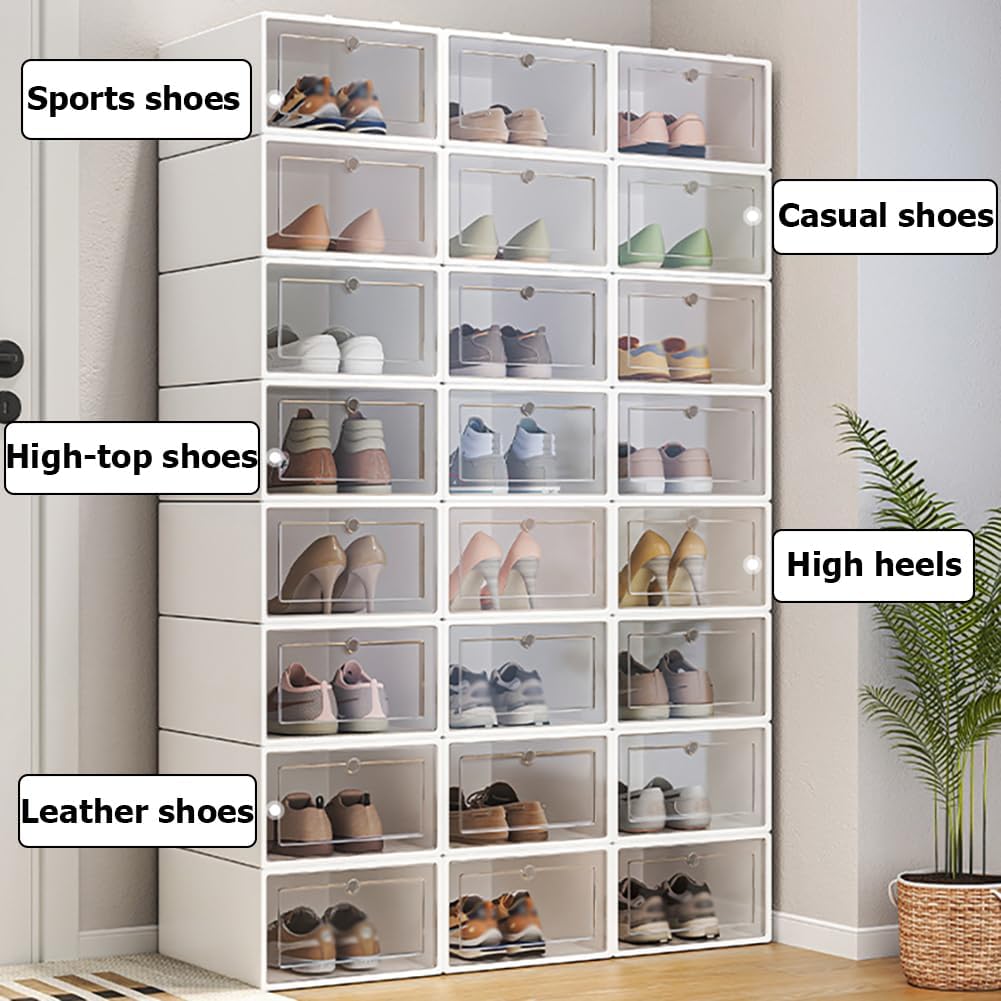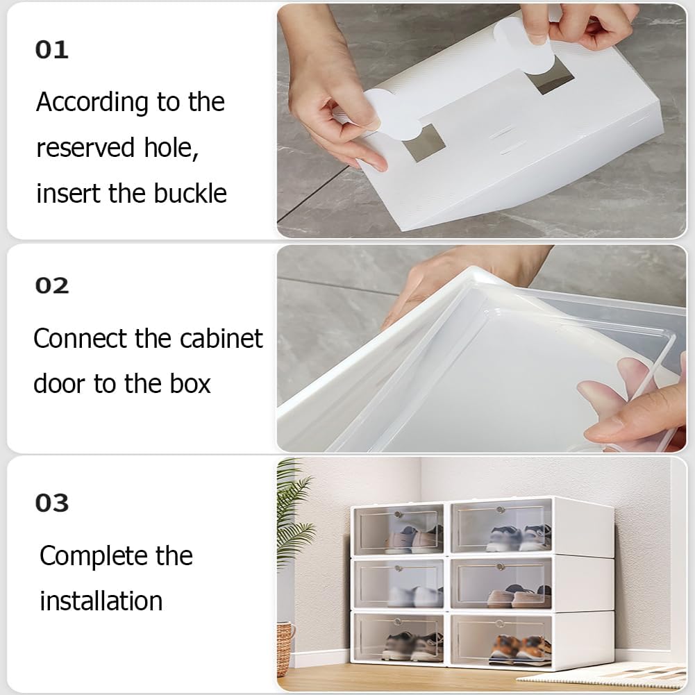 These sturdy and reliable plastic shoe boxes provide a safe storage space for your favorite shoes! The plastic box is equipped with a fully transparent door, which can help you quickly identify the contents of the box. It is not only a shoe box, but also a small exhibition stand, allowing you to proudly show your shoes, boots and other collections to your friends. The shoe box can be folded and stored when not in use to save space!Color: white, black, blue, greenMaterial: plasticSize: 24*33*13.5CMPackaging Contents:Shoe box * 24