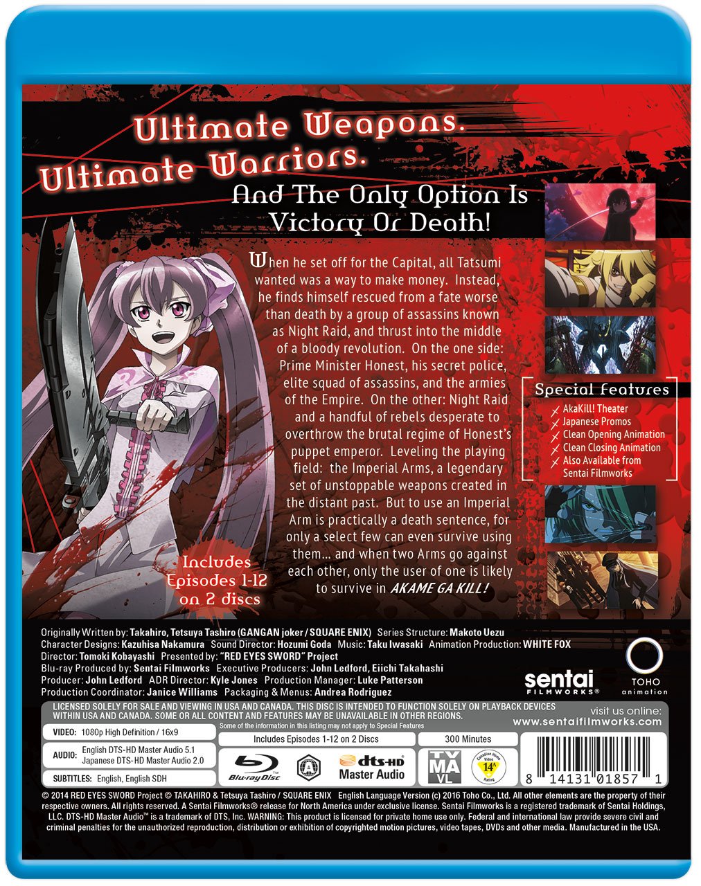When he set off for the Capital, all Tatsumi wanted was a way to make money. Instead, he finds himself rescued from a fate worse than death by a group of assassins known as Night Raid, and thrust into the middle of a bloody revolution. On the one side: Prime Minister Honest, his secret police, elite squad of assassins, and the armies of the Empire. On the other: Night Raid and a handful of rebels desperate to overthrow the brutal regime of Honest's puppet emperor. Leveling the playing field: the Imperial Arms, a legendary set of unstoppable weapons created in the distant past. But to use an Imperial Arm is practically a death sentence, for only a select few can even survive using them... and when two Arms go against each other, only the user of one is likely to survive in AKAME GA KILL!