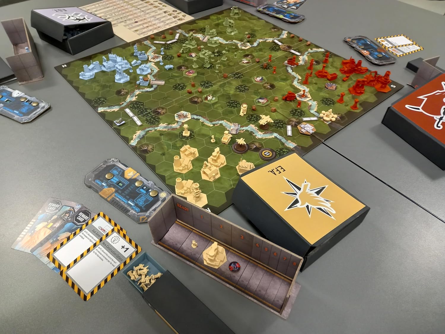 Dominate & Delegate was inspired by the video game Command & Conquer. Dominate & Delegate is a tactical game with a role-playing feeling. The game features resource gathering, base building, energy management, fog of war, combat, capturing system, transport units, special units, a reward system, and role-playing elements. The combat system involves no luck or hit point management. It was designed to be played very quickly but tactically with the figures There are outdoor missions and indoor missions. Indoor missions are escape-the-room-like dungeon crawlers. 1-4 players. 72 plastic building figures in 4 different colors 200 plastic unit figures in 4 different colors 40 plastic resource figures 1 foldable double-sided hex spaces board 11 outdoor tiles 17 indoor tiles 4 resource indicators 79 game cards Many tokens Skirmish mode Campaign mode