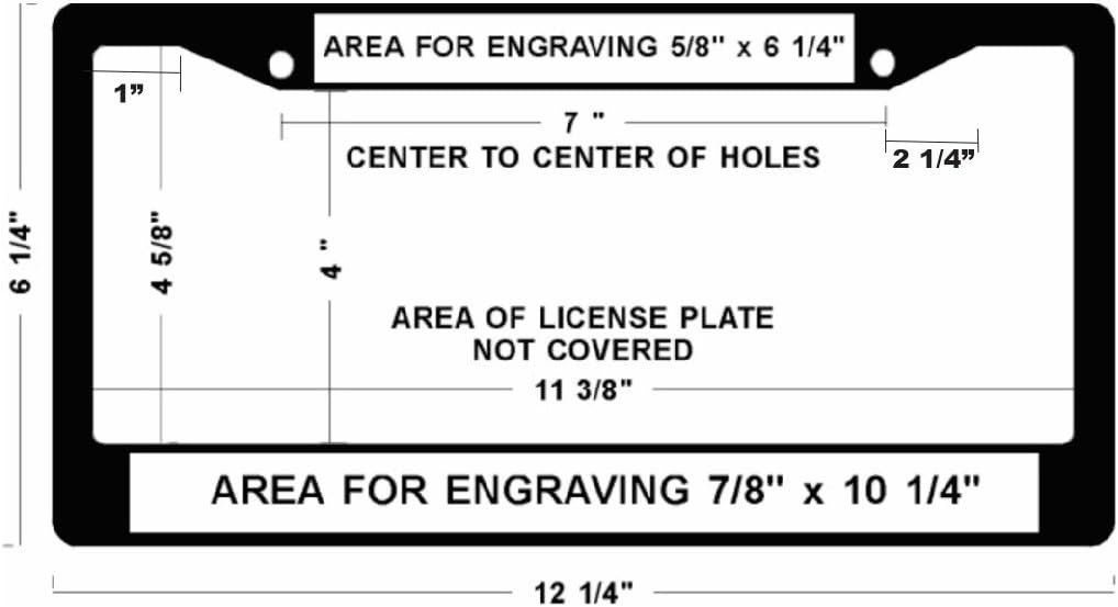 This high quality metal frame is shiny chrome-plated. It will fit standard American license plates.This one fits license plates with the registration tags on the top. Check your state to see if yours are on the top or bottom. We can do ones for states with bottom tabs. Just ask for it. The saying is on plastic strips that we engrave.
