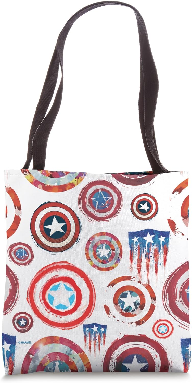 Captain America Superhero design. Wield the shield belonging to Steve Rogers in its many legendary iterations with this Captain America design, available in a tote bag or pillow. This heroic all-over print showcases red, white, and blue paint splattered vibranium shields belonging to the formidable fighter known as Captain America! Use this versatile Marvel tote as a reusable grocery bag, travel bag and book bag, or give your living space the heroic touch with this Captain America pillow, perfect for a child's bedroom, living room or office.