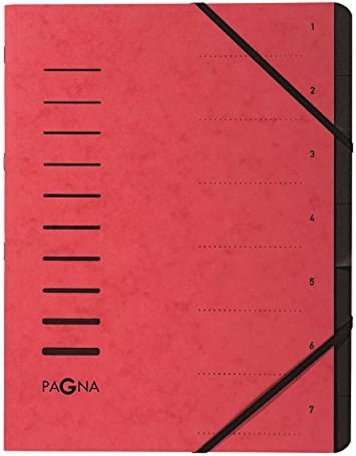 File folder. For A4 documents. 7 compartments Blue. Made of durable pressed chip. With black elasticated corners. 2 holes in the book pad. Black index tabs made of sturdy cardboard for quick access to documents. Printed 1-7 on the lid. Can be written on.