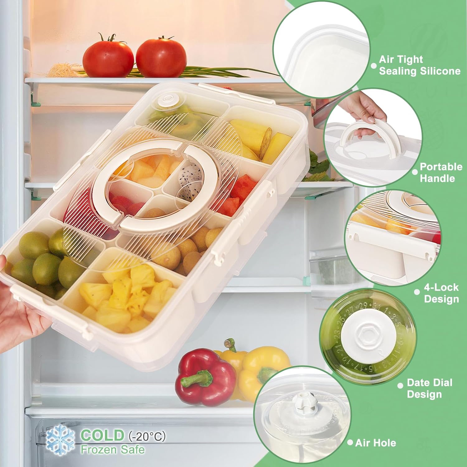 • SMART FRESHNESS CONTAINER: Snack tray is equipped with a date dial, which can track storage time to avoid food expiration. Breathable holes prevent spoilage, upgraded silicone sealing rings with a quadruple locking system effectively block odors and external air, and keep food fresh for a long time